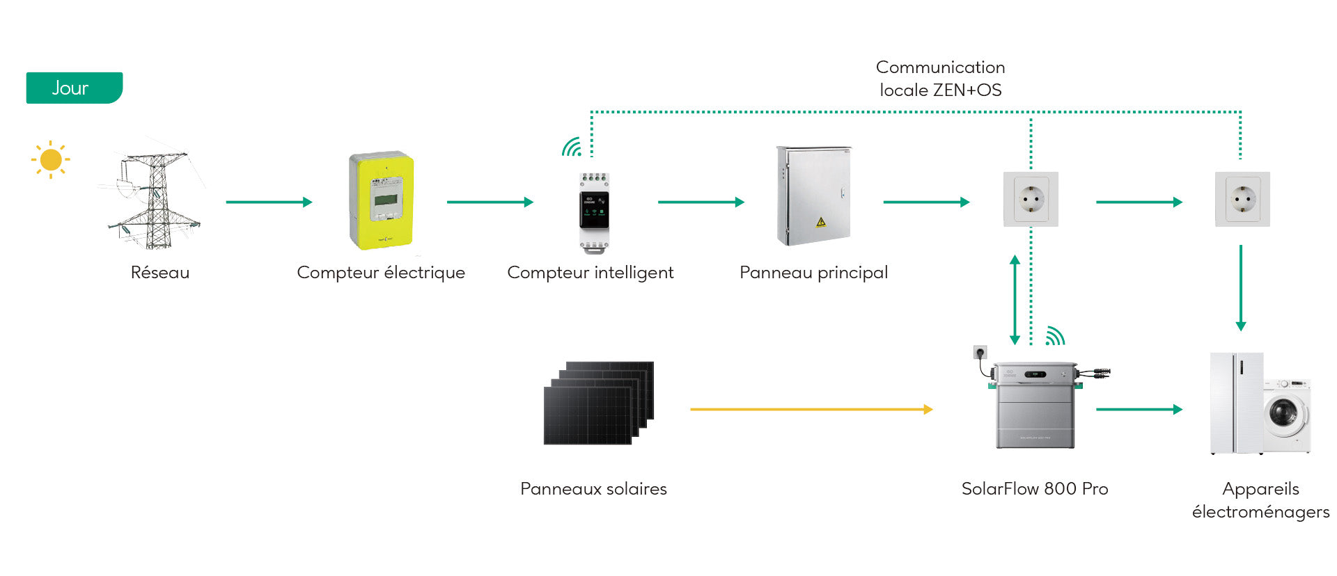 Découvrez la performance et la simplicité d’une gestion énergétique intelligente. Pendant la journée, le SolarFlow 800 Pro alimente votre maison en énergie solaire et stocke l’excédent dans la batterie. Le soir, la batterie prend le relais et fournit l’énergie nécessaire à votre maison. Cette gestion efficace de l’énergie réduit votre dépendance au réseau et vous permet de réaliser des économies.